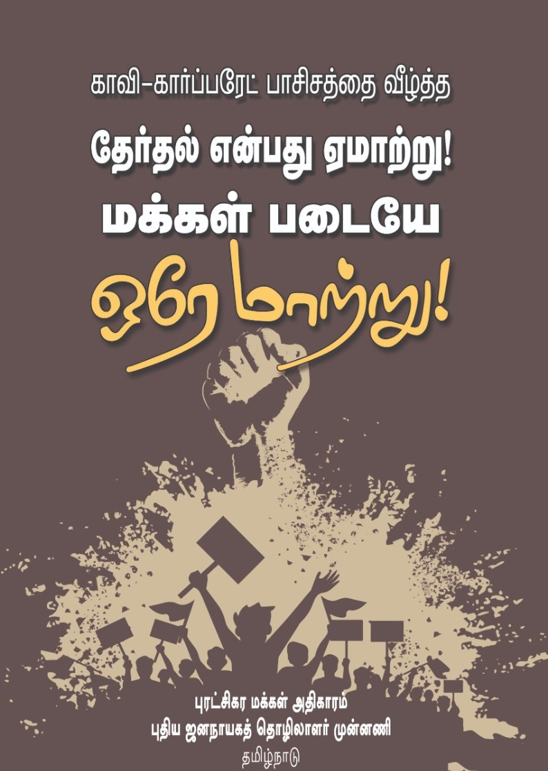 தேர்தல் பிரச்சாரங்கள் ஒரு சுனாமி போல மக்களை மூழ்கடித்து வரும் நிலையில்,தேர்தலின் மூலம் பாசிசத்தை ஏன் வீழ்த்த முடியாது என்பதையும் பாசிசத்தையும் அதைக் கொண்டு வரும் கும்பலையும் வீழ்த்துவதற்கான சரியான, நிச்சயகரமான பாதை என்ன என்பதையும் விளக்கி இச்சிறு வெளியீட்டை புரட்சிகர மக்கள் அதிகாரம் அமைப்பு கொண்டு வந்துள்ளது.