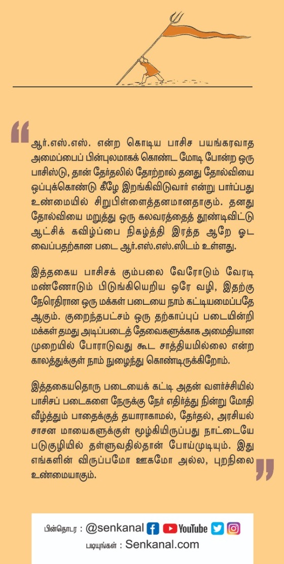 மிகவும் நெருக்கடியான சூழலில் இவ்வெளியீடு கொண்டு வரப்பட்டுள்ளது. பாசிசத்தை வீழ்த்துவதில் அக்கறையுள்ள ஜனநாயக சக்திகளும் உழைக்கும் மக்களும் இதை வாங்கிப் படிக்குமாறும், பரப்புமாறும் கேட்டுக் கொள்கிறோம்.