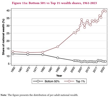 மேலும் உலக சமத்துவமின்மை ஆய்வகத்தின் ஆய்வில் பின்வரும் தரவுகளும் வெளிவந்துள்ளது. அதாவது 1962-2023 கால கட்டங்களில் மொத்த தேசிய சொத்தில் பெரும் பணக்காரர்களான 1% பேர் மற்றும் அடுத்தபடியாக உள்ள 40% பேர் எவ்வளவு பங்கு சொத்துக்களை வைத்துள்ளனர் என்ற தரவாகும். இதில் 1980-க்கு பின்பாக, அதவாது தனியார்மயம், தாராளமயம், உலகமயம் என்ற நவீன தாராளவாத, மறுகாலனிய பொருளாதார கொள்கை அமுல்படுத்தப்பட தொடங்கியதற்குப் பின்பு, மேற்தட்டு 1% மக்களிடம் சொத்து குவிய தொடங்குவதையும் கீழ்த்தட்டு 50% மக்களின் சொத்தின் பங்கு வீழ்வதையும் பார்க்க முடிகிறது. குறிப்பாக 1991ல் மறுகாலனியக் கொள்கைகள் அமலான பின்பு மேற்தட்டு 1% மக்களுடைய சொத்தின் பங்கு செங்குத்தாக அதிகரித்து (steep increase) 2023-யில் ஏறத்தாழ 40% ஆக உயர்ந்துள்ளது. அதாவது மேற்தட்டு 1% பேரிடம் சொத்து பங்கு குவிந்து கொண்டே போகிறது; கீழ்த்தட்டு 50% மக்களிடம் சொத்தில் பங்கு கிடைக்காமல் தொடர்கிறது.