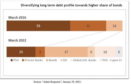 “2015 மற்றும் 2021 க்கு இடையில், ஆறு வெவ்வேறு அதானி குழும நிறுவனங்கள், அமெரிக்க மற்றும் ஐரோப்பிய முதலீட்டு வங்கிகளால் சந்தைப்படுத்தப்பட்ட 18 அமெரிக்க டாலர் மதிப்பிலான பத்திர விற்பனை மூலம் சுமார் $10 பில்லியனை திரட்டின – ஃபோர்ப்ஸ் இந்த வங்கிகளுக்கு “ஜூசி ஃபீஸ்” என்று அழைத்தது. குழுமத்தின் முதல் ஐந்து நிறுவனங்களின் கடன் மார்ச் 2019 மற்றும் மார்ச் 2022க்கு இடையில் ரூ. 83,600 கோடி அதிகரித்தது (தொடர்புடைய கட்சிகள் மற்றும் குழுவில் உள்ள பிற நிறுவனங்களின் கடன்களைத் தவிர்த்து). இந்த கடன் வளர்ச்சியில், 56 சதவீதம் வெளிநாட்டு கடன் பத்திரங்கள் மட்டுமே” 7