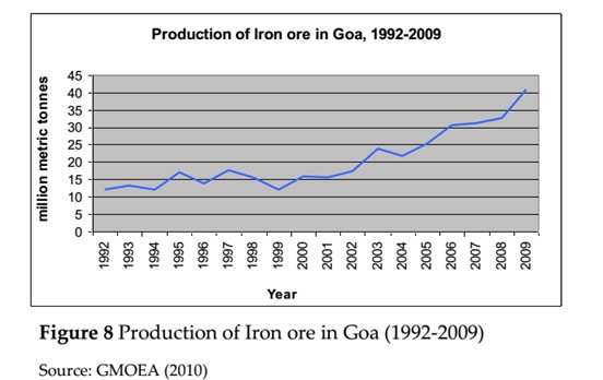 மேற்குத் தொடர்ச்சி மலையின் பெரும்பாலான சுரங்கப் பணிகள் கோவா, மகாராஷ்டிரம், கர்நாடகத்தில்தான் நடக்கிறது. கோவாவின் பொருளாதாரத்தில் சுற்றுலாத் துறைக்கு அடுத்த நிலையில் குவாரி மற்றும் சுரங்கத் துறைதான் இருக்கிறது. அம்மாநிலாத்தில் 1992-இல் 12 மில்லியன் மெட்ரிக் டண்ணாக இருந்த இரும்புத்தாது உற்பத்தியானது 2009-இல் சுமார் 42 மில்லியன் மெட்ரிக் டண்ணாக உயர்ந்ததைப் பார்த்தால் மறுகாலனியாக்கம் எந்தளவு துரிதகதியில் அம்மலையை சீரழித்துள்ளது என்பதைப் புரிந்துகொள்ளலாம். ‘நமது நாட்டின் தேவைகளுகாகத் தானே இரும்பை வெட்டுகிறோம்’ என்று சிந்திப்பவர்களுக்காகச் சொல்கிறோம். 2011 கணக்கீட்டின்படி கோவாவில் வெட்டியெடுக்கப்படும் இரும்புத்தாது 100% வெளிநாடுகளுக்குத்தான் ஏற்றுமதி செய்யப்பட்டது. குறிப்பாக, 89% சீனாவுக்கும் 8% ஜப்பானும் ஏற்றுமதியாகின.[5]