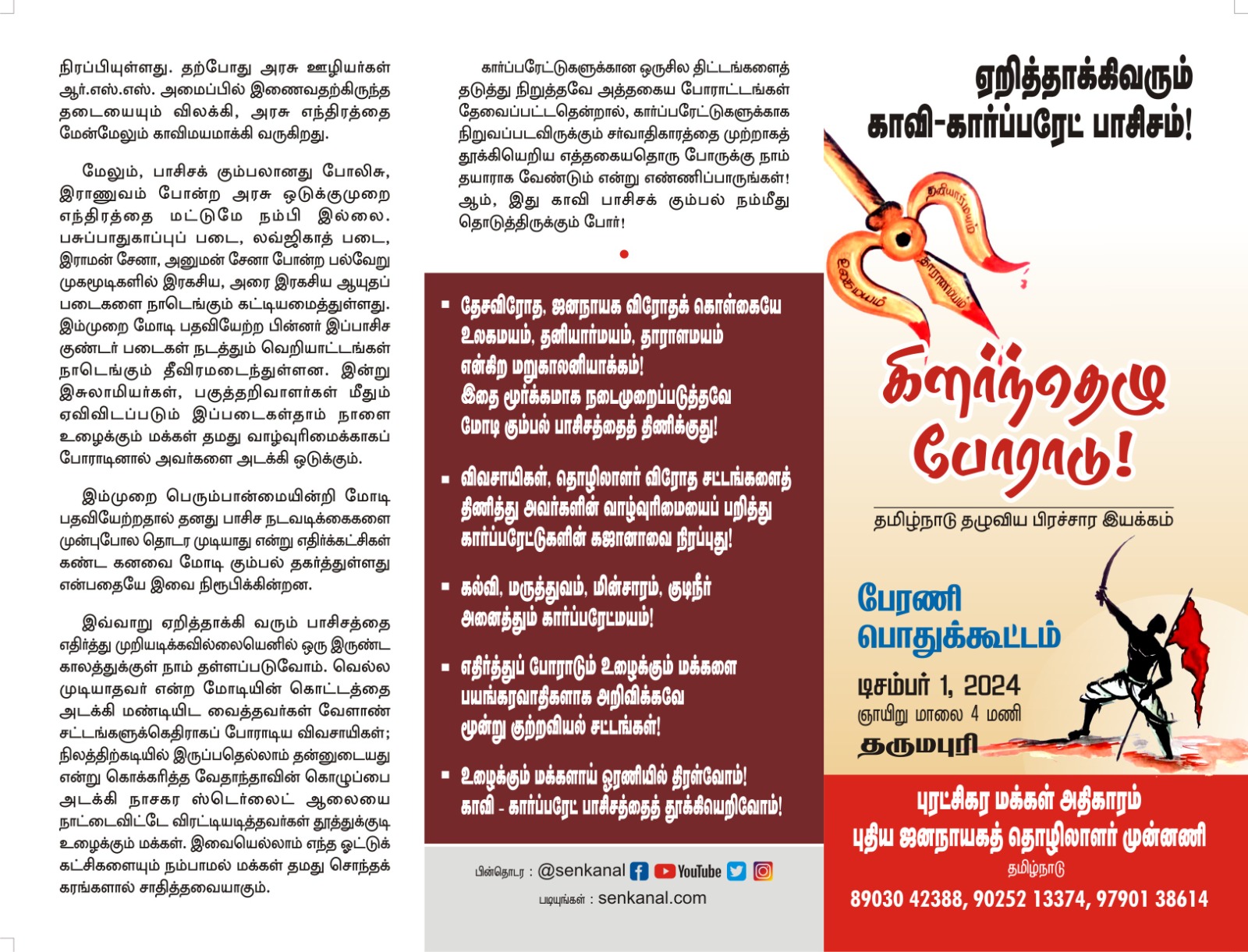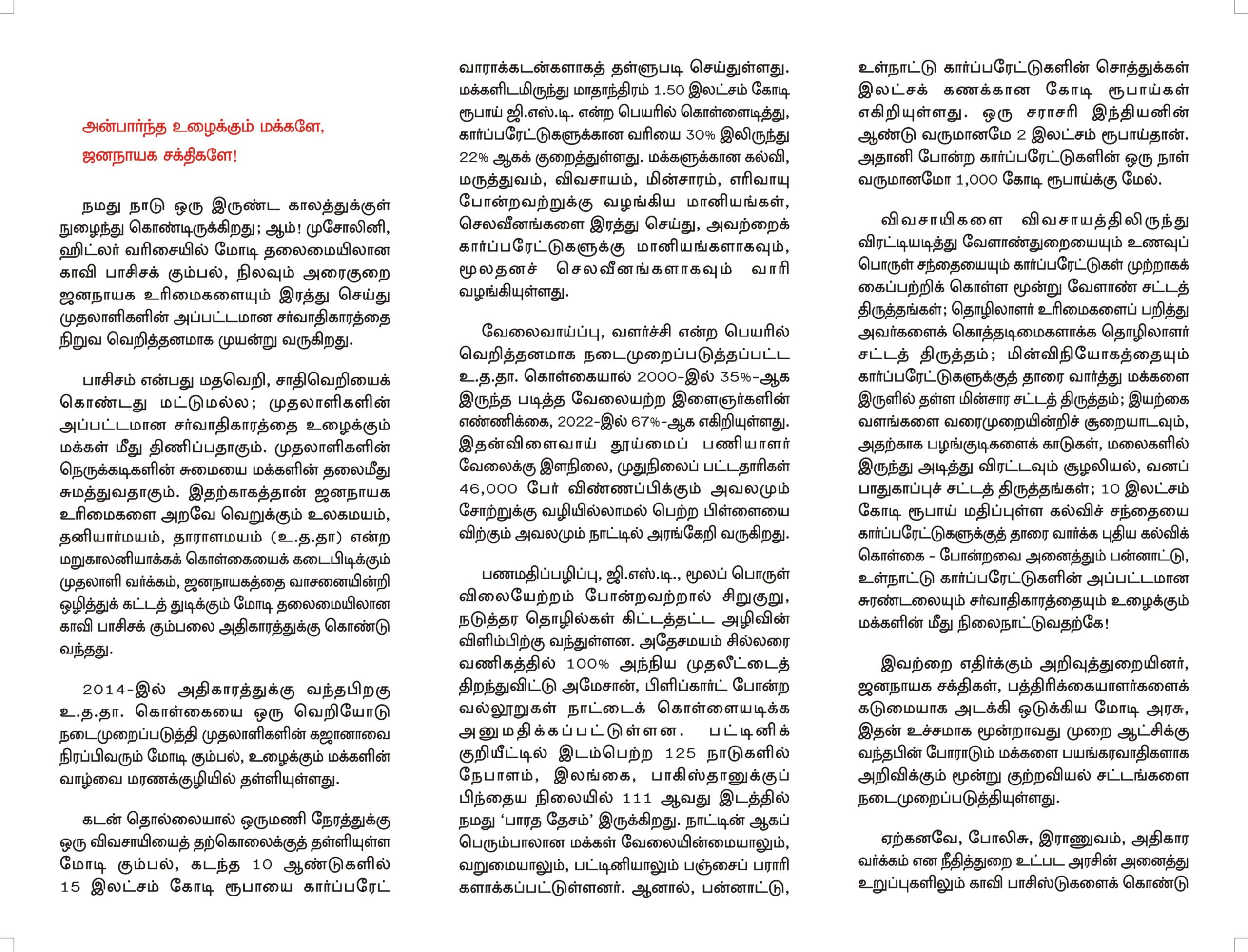 - உழைக்கும் மக்களாய் ஓரணியில் திரள்வோம்! காவி-கார்ப்பரேட் பாசிசத்தைத் தூக்கியெறிவோம்!