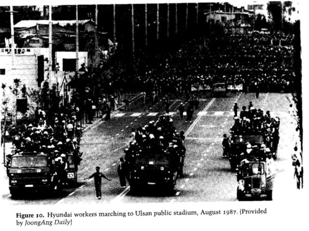 உல்சான் நகரத்திலுள்ள ஹூண்டாய் நிறுவனத்தில் வேலைபார்த்துவந்த நூறு தொழிலாளர்கள் இரகசியமாக தொழிற்சங்க வேலைகளை முன்னெடுத்தனர். மேலும் ஒரு மாதத்திற்குள்ளாகவே ஹூண்டாய் நிறுவனத்தின் பன்னிரெண்டு தொழிற்சாலைகளிலும் தொழிற்சங்கங்கள் உருவாக்கப்பட்டது. இதற்கு முக்கியக் காரணம் 1987-ம் ஆண்டு தொழிலாளர்களும், மாணவர்களும் நடத்திய போராட்டங்களே ஆகும். பல சிறிய தொழிற்சாலைகளிலும் கூட இப்போராட்டம் பரவியது. இந்தக் காலகட்டத்தில் நாடு முழுவதும் 3500 தொழிற்சங்கங்கள் உருவானது. இதற்கு முன்பு தென்கொரிய அரசுக்குச் சாதகமாகச் செயல்பட்டு வந்த தென்கொரியத் தொழிலாளர்கள் கூட்டமைப்புக்கு (FKTU) மாற்றாக கொரியத் தொழிலாளர்கள் அமைப்பு எனும் (KCTU) தொழிற்சங்கம் புதிதாக உருவாக்கப்பட்டது. இதில் இலட்சக்கணக்கான தொழிலாளர்கள் இணைந்து தங்களது உரிமைகளுக்காகப் போராட ஆரம்பித்தனர். கப்பற்கட்டும் ஆலைகள், வாகனத் தொழிற்சாலைகள், வாகன உதிரிபாகங்கள் தயாரிக்கும் தொழிற்சாலைகள் எனத் தொழிலாளர்களின் எண்ணிக்கை அதிகமானது.