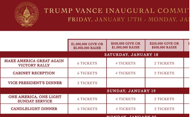 டிரம்பின் பதவியேற்பு விழா கமிட்டிக்கு 250 மில்லியன் டாலர் அளவிற்கு நிதி அளிக்கப்பட்டுள்ளது. இந்திய ருபாய் மதிப்பில் இது இரண்டாயிரம் கோடிகளுக்கும் அதிகம். பதவியேற்பு விழாவிற்கு முன்பும் பின்னரும் நடைபெற்ற பல்வேறு நிகழ்ச்சிகளில் கலந்து கொள்வதற்கு தலைக்கு இத்தனை ஆயிரம் அமெரிக்க டாலர்கள் என விலை நிர்ணயம் செய்து வசூலித்திருக்கிறார் டிரம்ப். டிரம்புடன் ஒரு சில மணித்துளிகள் நேரில் பேசுவதற்கு குறைந்தபட்சம் ஒரு மில்லியன் அமெரிக்க டாலர் (8.6 கோடி ருபாய்) கட்டணமாக நிர்ணயிக்கப்பட்டிருக்கிறது.
