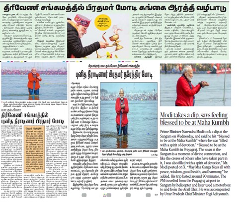 பத்திரிக்கைகளும் மோடியின் மனம் குளிரும் வகையில் அவர் கும்பமேளாவில் குளித்தது தொடங்கி, படகுச் சவாரி செய்தது வரை அனைத்தையும் விலாவரியாகப் படங்களுடன் எழுதி வெளியிடுகின்றன. தமிழ் இந்து நாளேடு மோடி கங்கையில் குளித்த செய்தியை முதல் பக்கத்தில் வெளியிட்டு, நாட்டில் உள்ள ஆன்மீக நகரங்களில் உள்கட்டமைப்பு வசதிகளை மேம்படுத்த மோடி உறுதிபூண்டுள்ளார் எனப் பாஜகவின் கட்சிப் பத்திரிக்கை போல புகழ்ந்து எழுதுகிறது. தமிழ்நாட்டில் இருக்கும் தமிழ் இந்து பத்திரிக்கையே இப்படியென்றால் வடஇந்திய ஊடகங்களைப் பற்றிச் சொல்லவே வேண்டாம்.