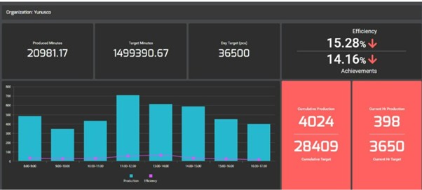 ஆலை முழுவதும் இருக்கும் Nidle கருவிகள் இணையம் வழியாக இணைக்கப்பட்டு அது தரும் தரவுகளை கணிணித் திரையில் நேரலையாக ஆலை நிர்வாகம் பார்க்க முடியும். இத்திரையில் ஒவ்வொரு தொழிலாளியும் மணிக்கு எவ்வளவு உற்பத்தி செய்திருக்கிறார்? அவர் தன் தினசரி இலக்கை எட்டினாரா? ஒவ்வொரு தொழிலாளியின் உற்பத்தித் திறன் எவ்வளவு? எந்த தொழிலாளியால் ஒட்டு மொத்த லைனின் உற்பத்தி திறன் (bottle neck station) குறைகிறது எனக் கணக்கீட முடியும்.