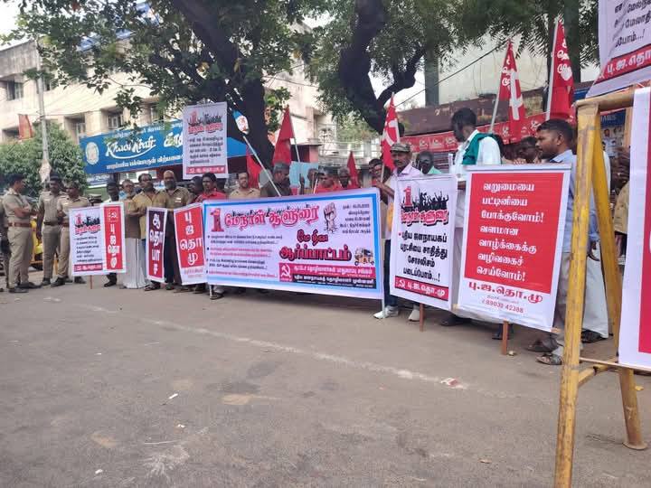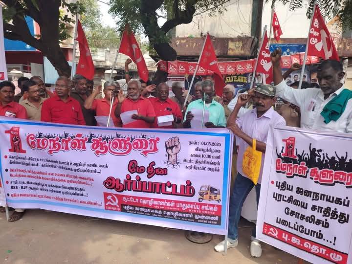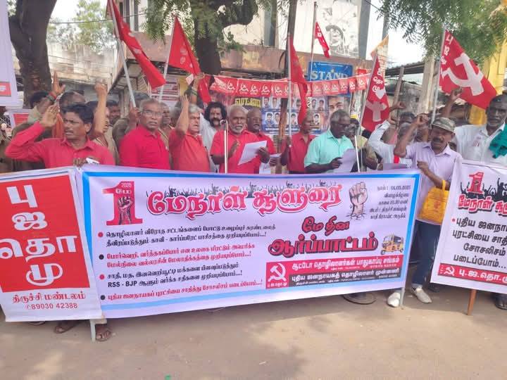 தொழிலாளர் விரோத சட்டங்களை போட்டு உழைப்புச் சுரண்டலை தீவிரப்படுத்தும் காவி – கார்ப்பரேட் பாசிசத்தை முறியடிக்க மே தினத்தில் சூளுரைப்போம் என்ற தலைப்பில் மே – 1 – 2025 அன்று காலை 10.30 மணிக்கு திருச்சி ஜங்ஷன் அருகில், புதிய ஜனநாயகத் தொழிலாளர் முன்னணி, ஆட்டோ தொழிலாளர் பாதுகாப்பு சங்கம், புரட்சிகர மக்கள் அதிகாரம் ஆகியவற்றின் சார்பாக ஆர்ப்பாட்டம் நடைபெற்றது. ஆர்ப்பாட்டத்திற்கு தோழர் சுந்தரராசு, மண்டல தலைவர், புதிய ஜனநாயக தொழிலாளர் முன்னணி அவர்கள் தலைமை தாங்கினார்.