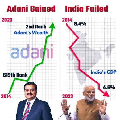பிரிட்டீஸ் ஆட்சிகாலத்தில் இருந்ததை விட மேசமான ஏற்றத்தாழ்வு சுதந்திர இந்தியாவில் தற்போது இருப்பதாக உலக ஏற்றத்தாழ்வு ஆய்வகம் கூறுகிறது. இந்தியாவின் மொத்த சொத்து மதிப்பில் 40% சொத்து முதல் 10% பெருமுதலாளிகளிடம் உள்ளது. கீழுள்ள 60% மக்களிடம், வெறும் 4.7% சொத்து மட்டுமே உள்ளதாக அந்நிறுவனம் கூறுகிறது. உதாரணமாக, 2014-இல் மோடி ஆட்சிக்கு வரும் போது அதானியின் சொத்து மதிப்பு 44,000 கோடியாக இருந்தது. இதுவே 2023-இல் 11.6 இலட்சம் கோடியாக, ஏறத்தாழ 2500 மடங்கு, அதிகரித்திருக்கிறது. அம்பானியின் சொத்தோ 350 மடங்கு ($18 பில்லியனிலிருந்து $82 பில்லியன்) உயர்ந்துள்ளது. 2014 மற்றும் 2022 க்கு இடையில், இந்திய பில்லியனர்களின் நிகர மதிப்பு 280 சதவீதத்திற்கும் அதிகமாக வளர்ந்துள்ளதாக ஆய்வுகள் கூறுகின்றன. இம்மதிப்புகளை இவர்கள் முன்வைக்கும் வறுமைக்கோடு அளவீடோடு ஒப்பிட்டுப் பார்த்தால் மோடி கும்பலின் கயமைத்தனத்தையும், வக்கிரத்தையும் நாம் புரிந்துக் கொள்ள முடியும்.