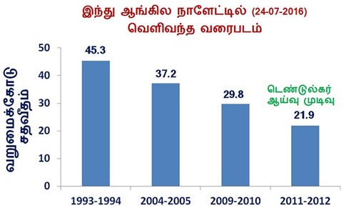 1990-களில் உலகமயம், தனியார்மயம், தாராளமயம் கொண்டுவரப்பட்ட பின்பு வறுமை ஒழிப்பு என்பதை ஒவ்வொரு அரசாங்கமும் தங்களது ஆட்சியின் சாதனையாக காட்டத் தொடங்கினர். ஆனால் இவர்கள் உண்மையில் வறுமையை ஒழிக்கவில்லை. வறுமையை நிர்ணயிப்பதற்கான அளவுகோல்களை தங்களுக்கு ஏற்றவாறு மாற்றியமைத்துக்கொண்டு வறுமையை ஒழித்து விட்டதாக ஏமாற்றி வருகின்றனர். 1993-94 இல் மன்மோகன் சிங் நிதி அமைச்சராக இருந்தபோது, ஒரு மனிதன் உண்ணும் உணவின் கலோரி மதிப்பின்படி வறுமைகோட்டைக் கணக்கிடும் முறையைக் கொண்டுவந்தார். அதன்படி 1987-88 இல் 25.5% ஆக இருந்த வறுமை விகிதம் 1993-94 இல் 19% ஆகக் குறைந்ததாகச் சொன்னார். பிறகு 2005 ஆம் ஆண்டில் டெண்டுல்கர் குழு, கிராமப்புறங்களில் ஒரு நபருக்கு மாதம் 447 ரூபாய்க்கு குறைவாகவும், நகர்ப்புறங்களில் 579 ரூபாய்க்கு குறைவாகவும் செலவிடுவதை வறுமையாக வரையறுத்தது. இந்த வரையறை கடுமையான விமர்சனத்திற்கு உள்ளானது.