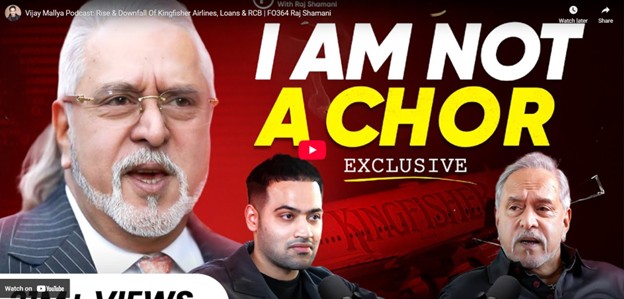இந்நிலையில் விஜய் மல்லையா ஒன்பது ஆண்டுகள் கழித்து ராஜ் ஷமானி என்ற யூடியூபரின் சேனலில் நான்கு மணி நேரத்திற்கும் மேலாக நீடித்த பாட்காஸ்ட் ஒன்றில் பேசியிருந்தார். அதன் சிறுபடம் (Thumbnail) “நான் திருடன் இல்லை” என்று கொட்டை எழுத்தில் இருந்தது. இதில் தன்மீதுள்ள பல்வேறு குற்றச்சாட்டுகளுக்கு எதிராக தன்னைத் தற்காத்துக் கொள்வதற்கு அவர் இந்த நேரத்தைப் பயன்படுத்திக்கொண்டு, தான் எந்தத் தவறும் செய்யவில்லை என்பதை நிரூபிக்க தன்னால் முடிந்த அனைத்தையும் செய்துள்ளார்.
