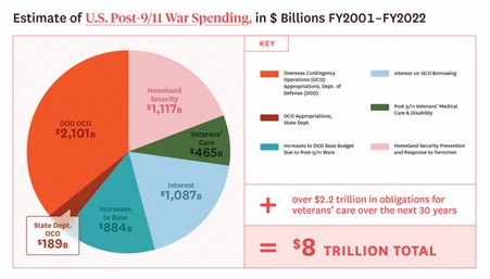 டிரம்ப் தனது தேர்தல் பிரச்சாரத்தில் எதிர்க்கட்சிகளை பார்த்து கேலி செய்ததைப் போல போர்கள் ஒன்றும் மலிவானவை அல்ல. பிரவுன் பல்கலைக் கழகத்தின் வாட்சன் எனும் சர்வதேச நிறுவனம் செப்டம்பர் 9/11 நிகழ்வுக்குப் பிறகு நடந்த போர்களுக்காக மட்டும் அமெரிக்கா தனது பட்ஜெட்டில் நேரடியாகவே 8 டிரில்லியன் டாலர் செலவிட்டுள்ளதாக மதிப்பிட்டுள்ளது. இஸ்ரேல் மீது ஹமாஸ் பயங்கரவாதக் குழு தாக்குதல் நடத்திய அக்டோபர் 7, 2023 லிருந்து செப்டம்பர் 30, 2024 வரை மட்டுமே இஸ்ரேலின் இராணுவச் செலவுகளுக்காகவும், அமெரிக்க இராணுவச் செலவுகளுக்காகவும் 22.76 பில்லியன் டாலர் செலவிடப்பட்டுள்ளதாக வாட்சன் நிறுவனம் மதிப்பிட்டுள்ளது. இத்தகைய இராணுவச் செலவுகள் அனைத்திற்கும் மேலே குறிப்பிட்ட வழியில் அமெரிக்கா கடன் வாங்கியே செலவு செய்து வருகிறது.