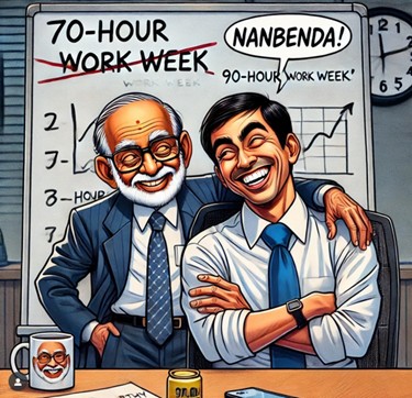 இந்தியர்கள் ஒருநாளைக்கு 70 மணிநேரம் வேலை செய்தால்தான் இந்தியா வளர்ந்த நாடாகும் என்று கதையளந்தார் பெரும் பணக்காரரான இன்போசிஸ் நாராயண மூர்த்தி. இதை பெருமுதலாளிகளும், தலைமை நிர்வாக அதிகாரிகளும் ஆதரித்து பேசிவருகின்றனர். பெருமுதலாளிகள் உல்லாச வாழ்க்கை நடத்த கடைநிலை ஊழியர்கள் கல்லறைக்குப் போகும்வரை 70 மணிநேரம் உழைக்க வேண்டும் என்பதே இவர்கள் கூறும் வளர்ச்சிக்கான சூத்திரம்.