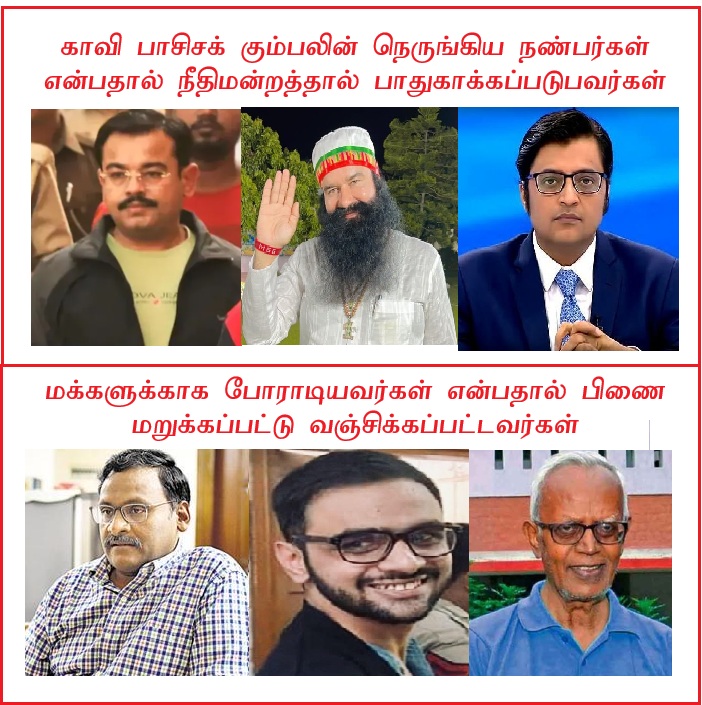 அதிலும் குறிப்பாக கொலை, பாலியல் வல்லுறவு உள்ளிட்ட குற்றச்சாட்டுகளில் கைது செய்யப்பட்டு சிறையில் அடைக்கப்பட்ட, குற்றம் நிரூபிக்கப்பட்டு தண்டனை அனுபவித்து வருகின்ற குற்றவாளிகளுக்கு அவர்கள் பாசிச சகதிகளின் ஆதரவாளர்களாக இருக்கும் காரணத்திற்காகவே மீண்டும் மீண்டும் பிணை வழங்கப்படுவதும், அதேசமயம் உழைக்கும் மக்களின் நலனுக்காகப் போராடிய ஜனநாயக சக்திகள், பத்திரிக்கையாளர்கள் உள்ளிட்டவர்களுக்குத் தொடர்ந்து பல ஆண்டுகளாகப் பிணை வழங்க மறுக்கப்படுவதும் நீதிமன்றங்களின் காவி பாசிச ஆதரவுத் தன்மையை அம்பலப்படுத்துகின்றன.